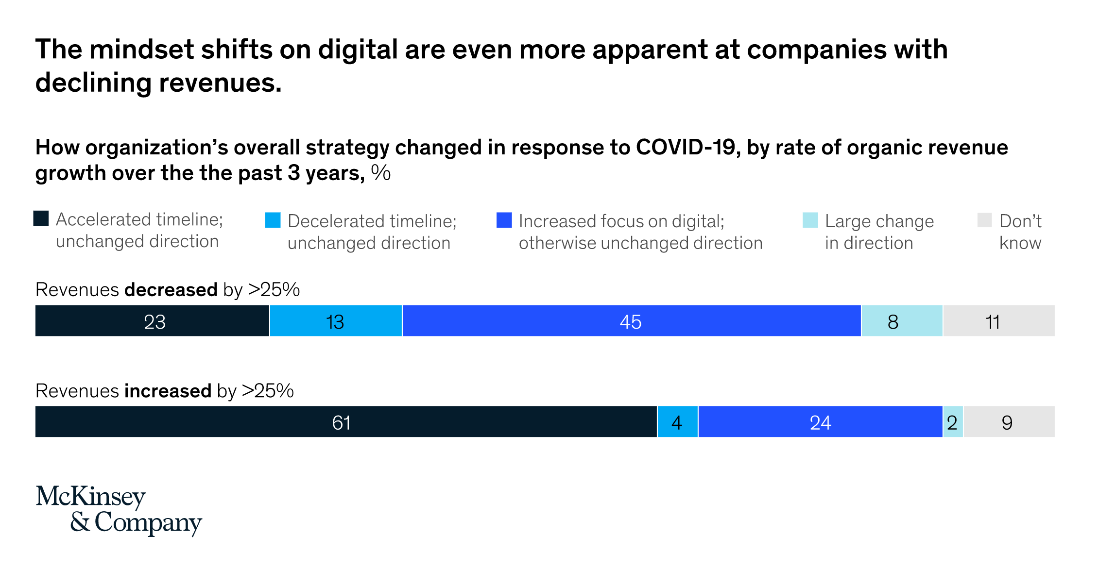 61% of organizations who had already adopted digital transformations, and accelerated their program during Covid-19, saw revenues increase by up to 25%. A further 24% who adopted an increased focus on digital saw similar results. Those that decelerated their timeline or faced large change in direction didn’t enjoy anything like the same results.